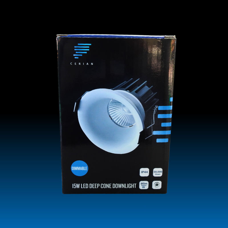 The Cerian 15W Deep Cone LED Downlight, anti-glare illumination with COB LED technology, a 60° beam angle, durable die-cast aluminium body, a long 50,000-hour lifespan