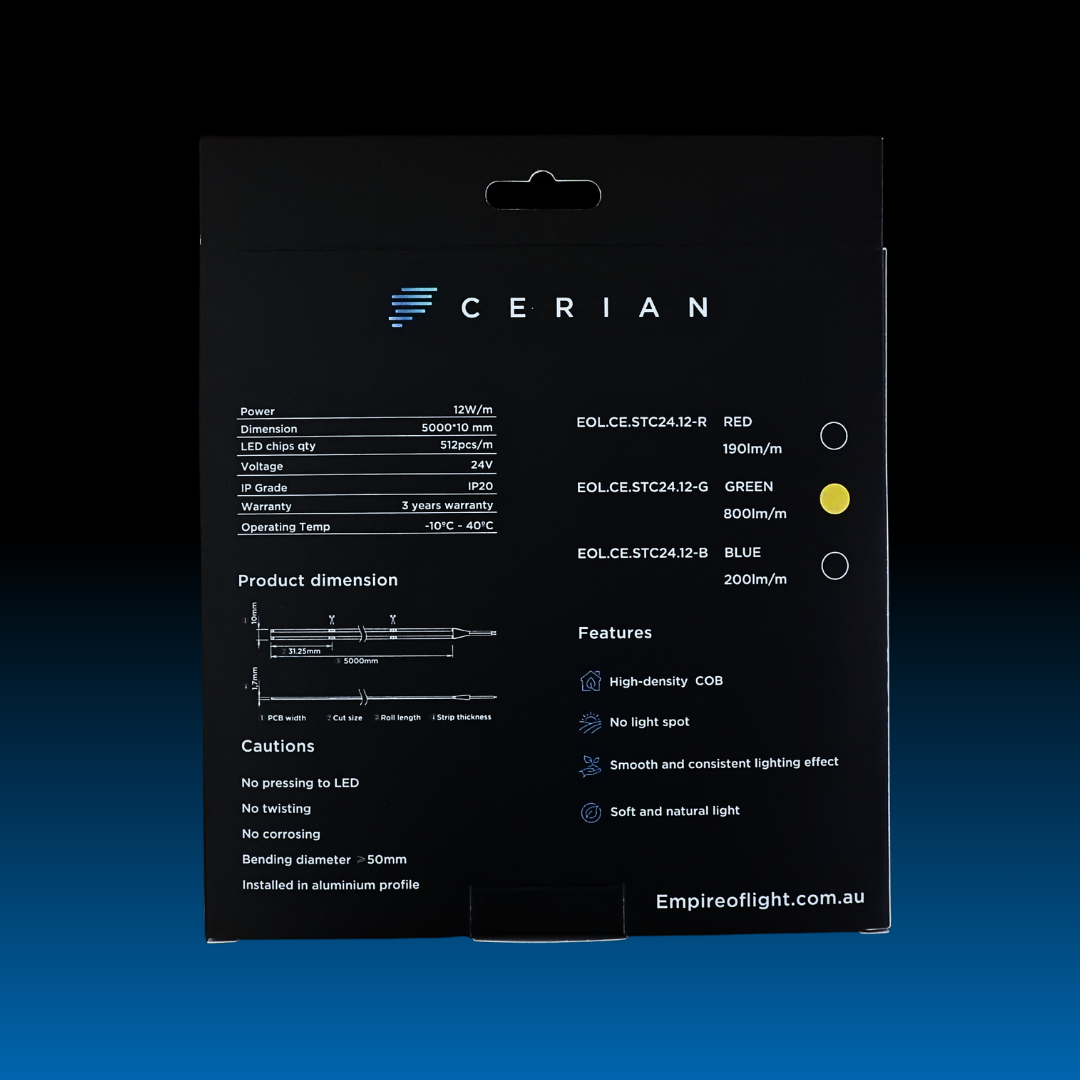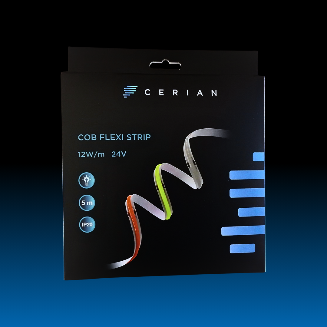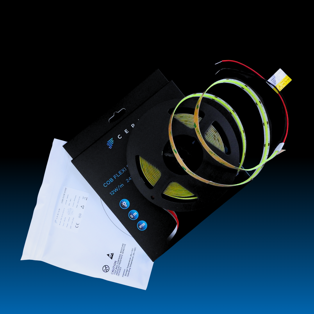 Upgrade your lighting projects with the CERIAN Green COB Flexi LED Strip Light, engineered for premium linear illumination without light spots. Featuring a 140° beam angle, high-density COB technology, and CRI >90, this strip delivers bright, accurate colour with exceptional uniformity—ideal for professional indoor lighting applications.