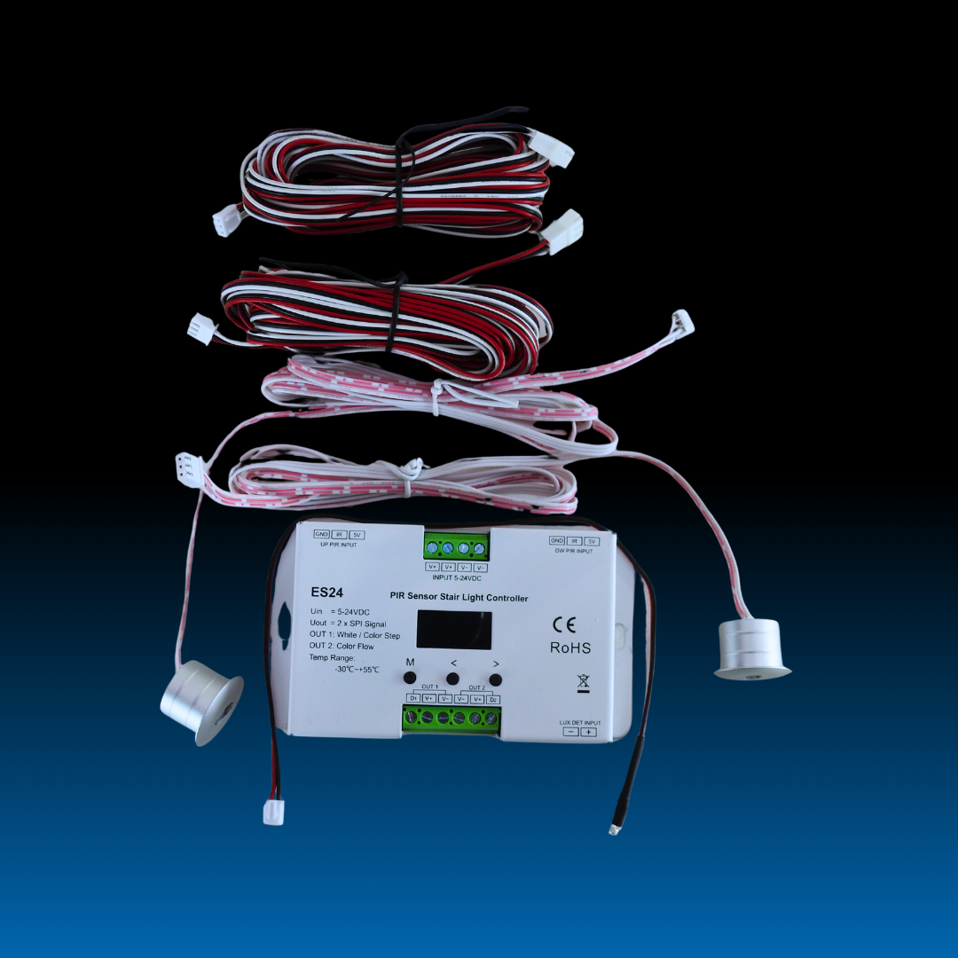 The PIR Sensor Stair Light Controller is a professional multi-function intelligent stair lighting system designed for dynamic RGB and white LED staircase illumination. Featuring dual PIR motion sensing, daylight detection, and dual SPI (TTL) signal outputs, this controller enables precise step-by-step lighting effects and flowing color animations.